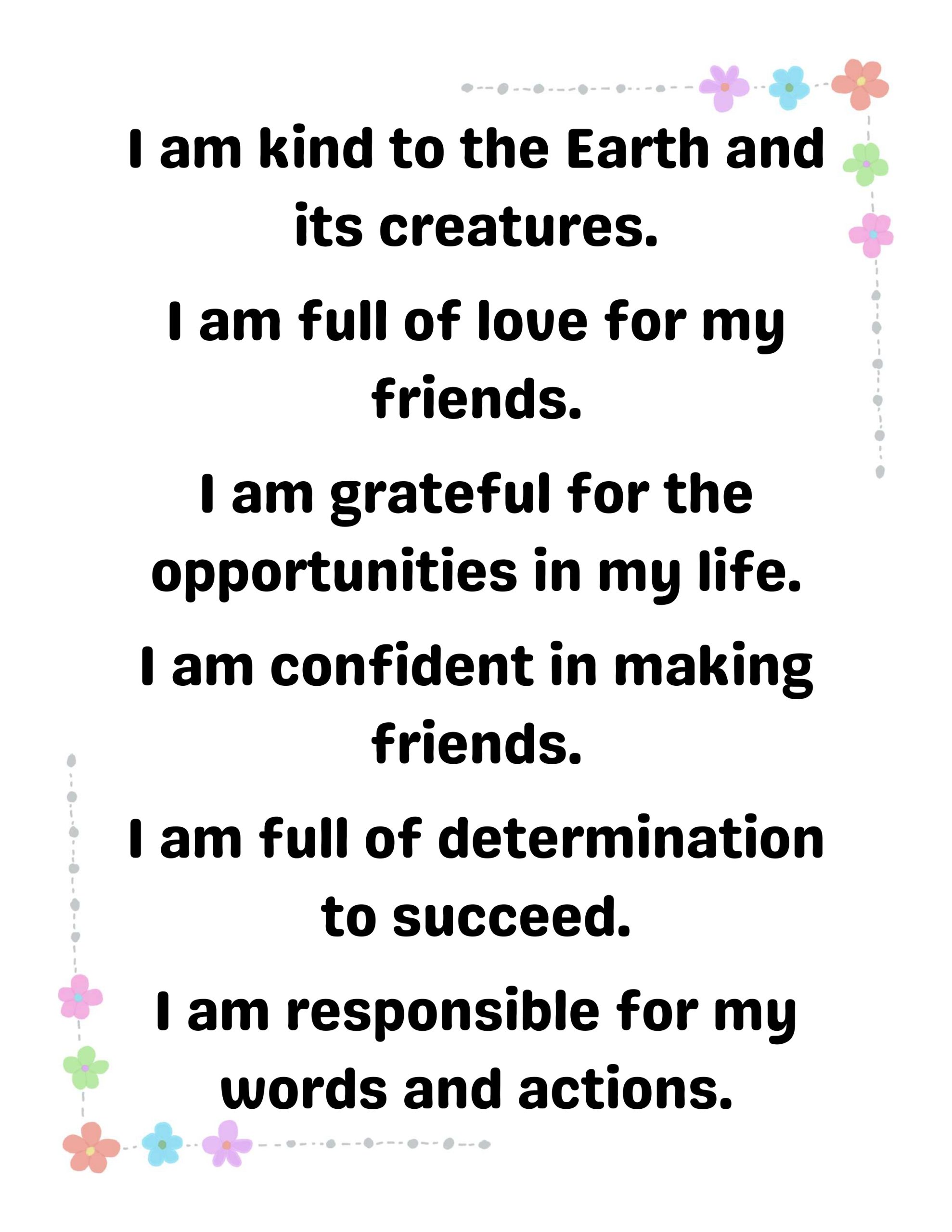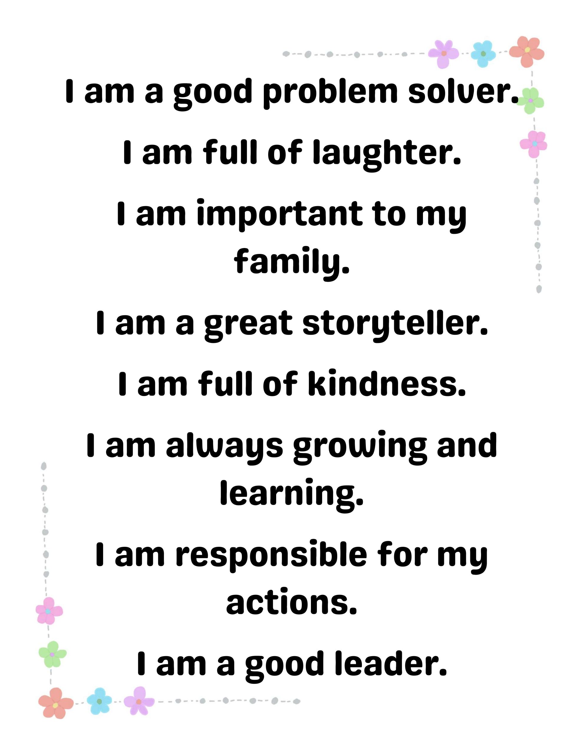 Social Skills: Reminders like “I am a good friend” and “I am kind to others.”